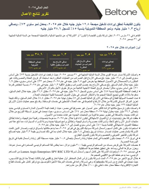 تعلن شركة بلتون القابضة (“بلتون” أو “الشركة”)، عن نتائجها المالية والتشغيلية المجمعة عن السنة المالية المنتهية في 31 ديسمبر 2025، وفقًا لـ”إنفستجيت“.
